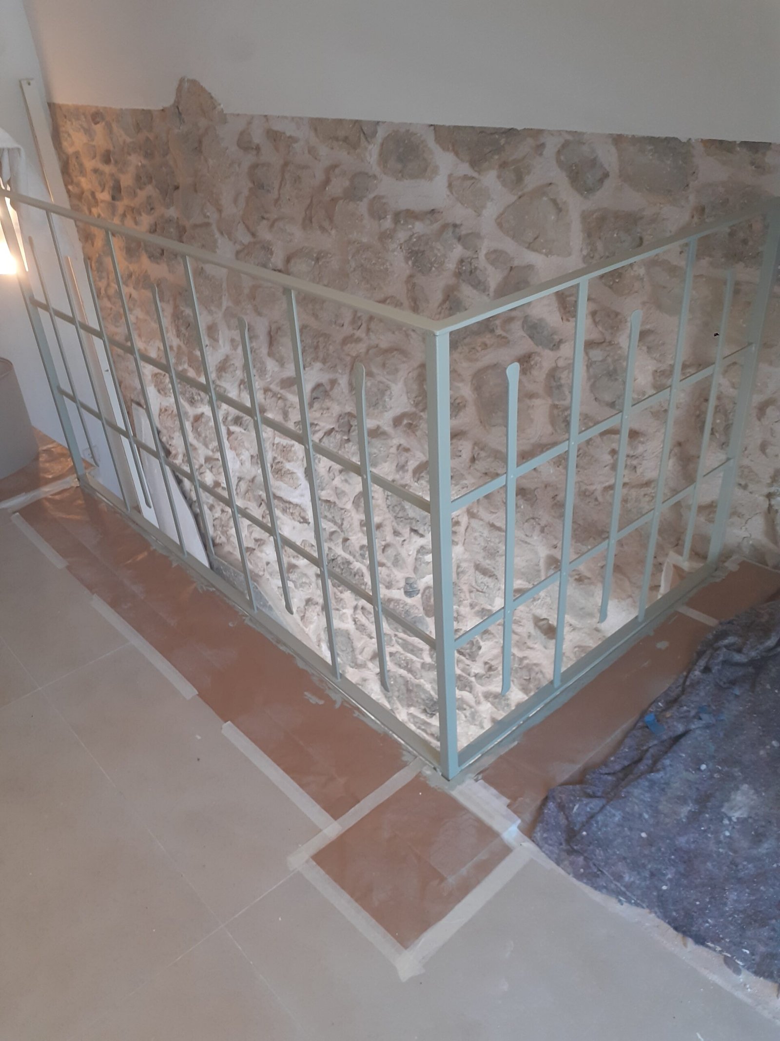 - Lijado y esmaltado de barandilla interior de hierro en casa de pueblo en Selva, Mallorca. Color French Gray. 7Catorce Proyectos