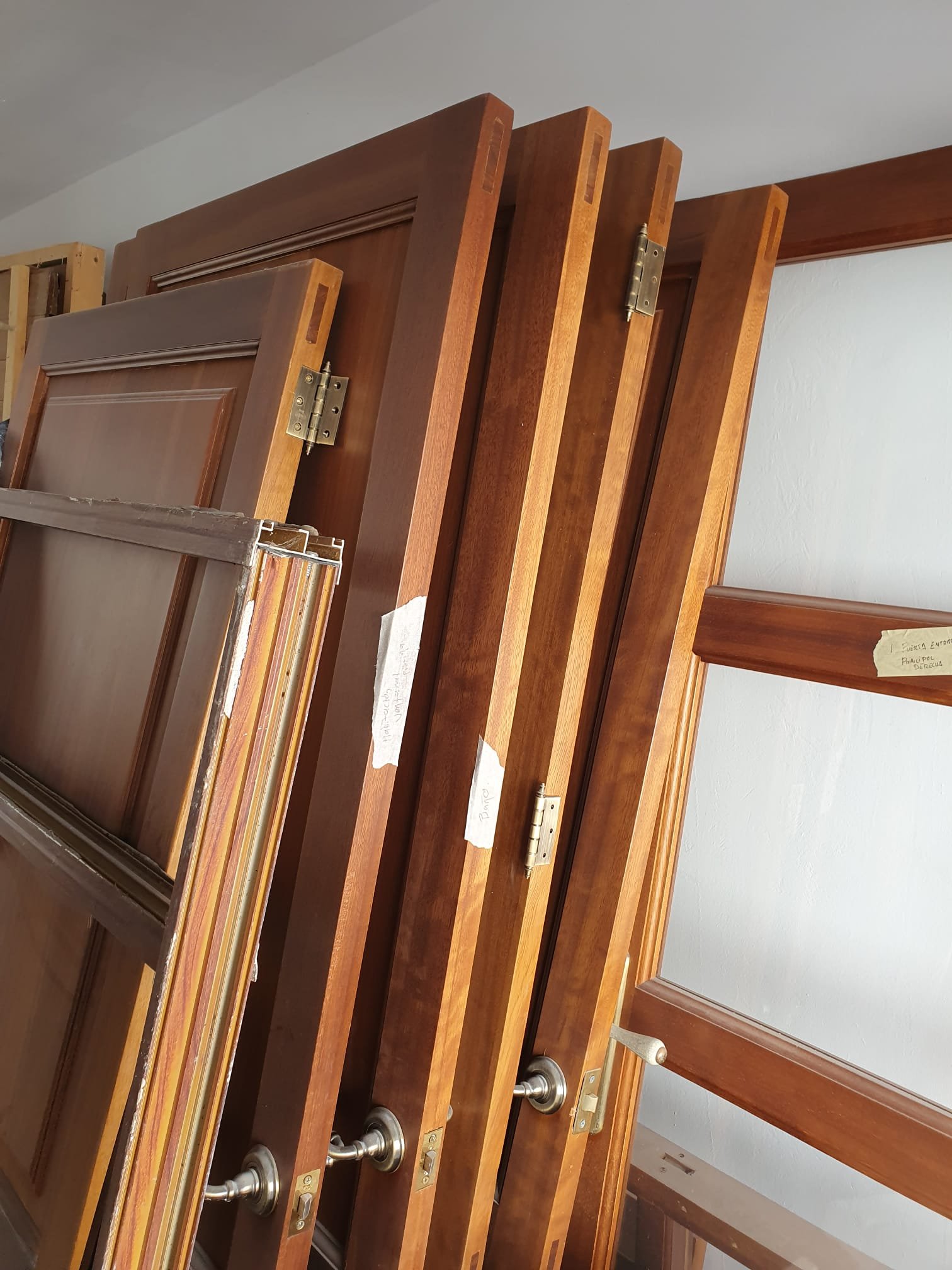 - Lacado en blanco de carpintería de madera en puerta de entrada en casa de pueblo en Selva, Mallorca. 7Catorce Proyectos